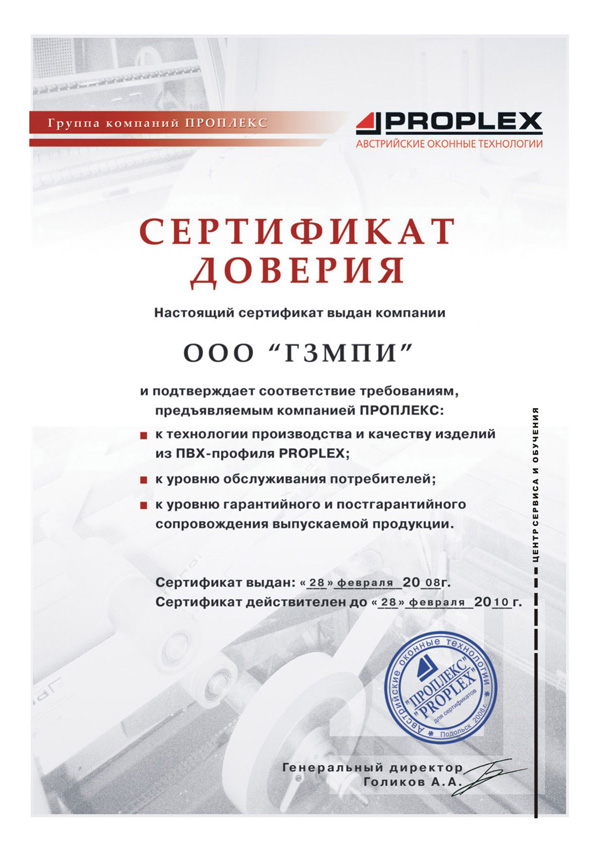 В феврале 2008 года были выданы два первых СЕРТИФИКАТА ДОВЕРИЯ ПРОПЛЕКС их получили компании ООО "ГЗМПИ" (Гатчинский Завод Металлопластиковых изделий) г. Гатчина и ООО "Арка" г. Уфа.